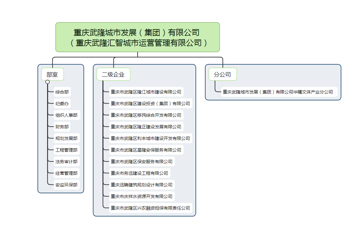 重庆武隆城市发展(集团)有限公司集公司内设综合部、纪委办、组织人事部、财务部、规划发展部、工程管理部、法务审计部、经营管理部、安监环保部等9个部室;下辖重庆市武隆区隆江城市建设有限公司、重庆市武隆区建设投资(集团)有限公司、重庆市武隆区移民综合开发有限公司、重庆市武隆区隆正建设发展有限公司、重庆市武隆区利丰城市建设开发有限公司、重庆市武隆区星隆安保服务有限公司、重庆市武隆区保安服务有限公司、重庆市务远建设工程有限公司、重庆远瞻建筑规划设计有限公司、重庆市庆祥水资源开发有限公司、重庆市武隆区兴农融资担保有限责任公司等11家全资子公司和1家重庆武隆城市发展(集团)有限公司华曜文体产业分公司。